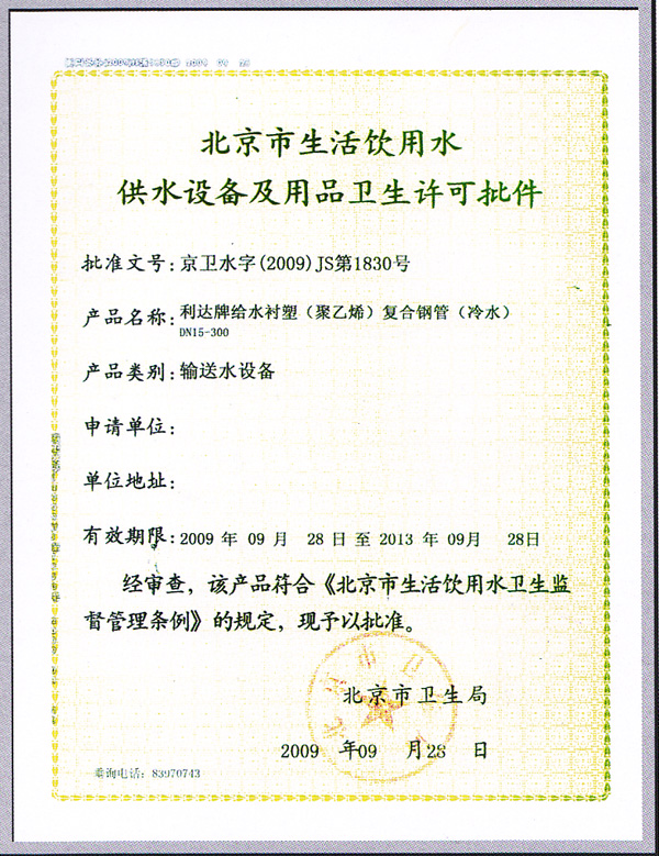 北京市生活飲用水供水設(shè)備及用品衛(wèi)生許可批件(冷水)