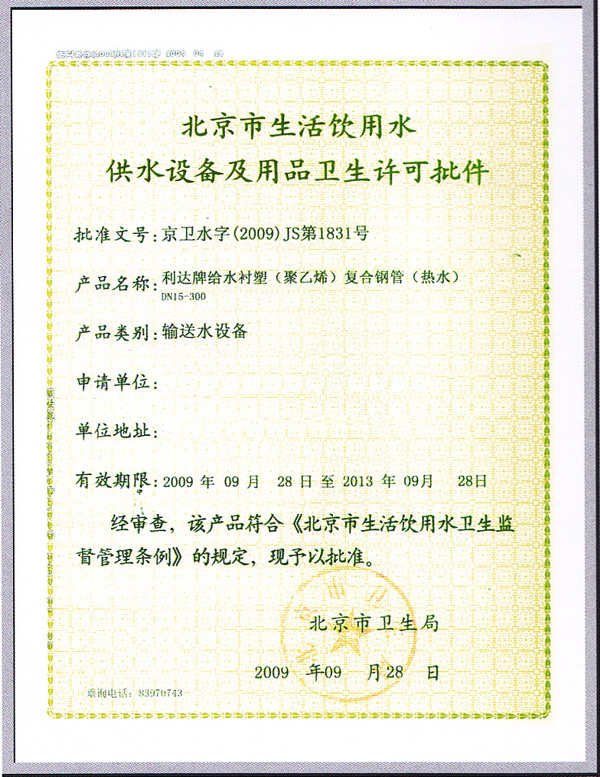 北京市生活飲用水供水設(shè)備及用品衛(wèi)生許可批件(熱水)